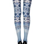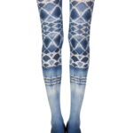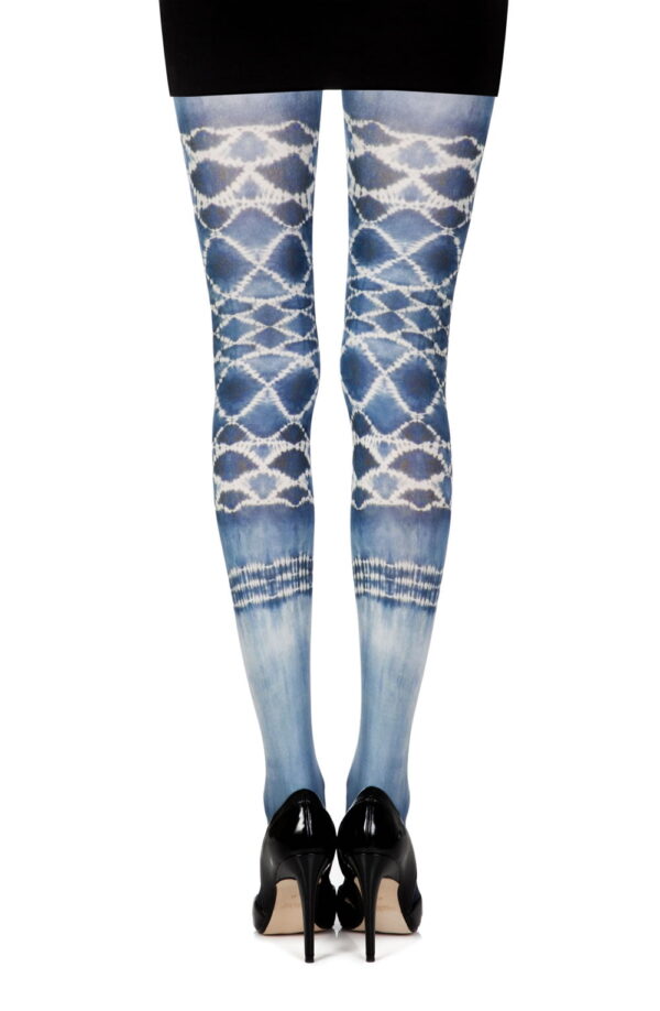 Opaque white 120 denier tights with special tie-dye printing technique. The print is on both legs front and back.