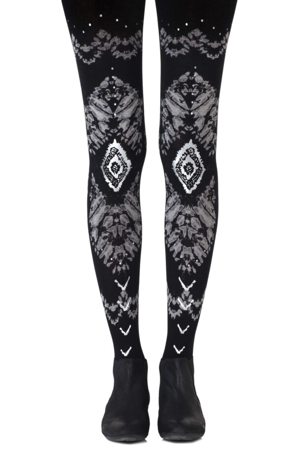 Return to the sixties with these tie-dye inspired tights that feature a unique allover pattern. Colour: Black tights with Grey Silver print. Thickness: 100 denier. Your entire leg will be getting Zohara love with allover prints. Both sides are not created equal with allover tights so please look at the foot of the tights before wearing to ensure you don’t step on the print. (The front print will be lower than the back.) Made from Cotton. No doubt you will shine with our metallic prints. Please note that these prints require extra care when washing and will naturally fade with wear. Unless they have X-ray vision no one will be able to see through these opaque tights. Hand print no two are the same.
