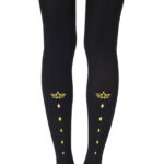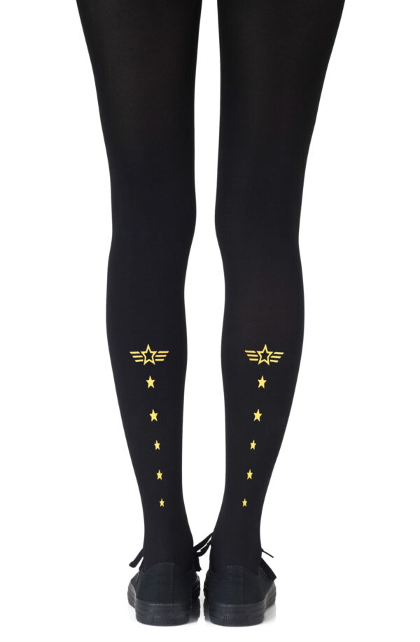 Wear your wings with pride with the Top Gun tights that feature a reversible pilot badge graphic. Colour: Black tights with Yellow print. Thickness: 120 denier. Unless they have X-ray vision no one will be able to see through these opaque tights. Is the party in the front or the back? You choose with reversible tights where to place all the fun. Hand print no two are the same.